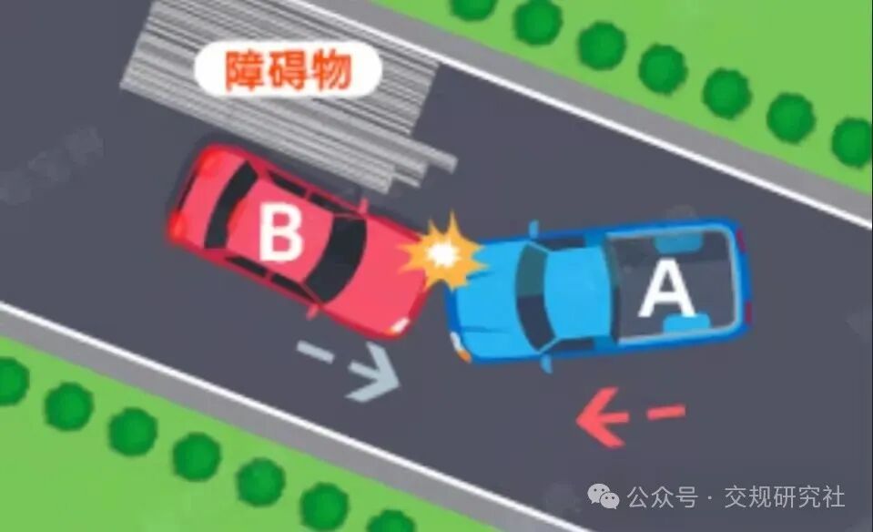 (八)在没有中心隔离设施或者没有中心线的道路上会车时,有障碍的一方未让无障碍的一方先行的,均为A车全责。