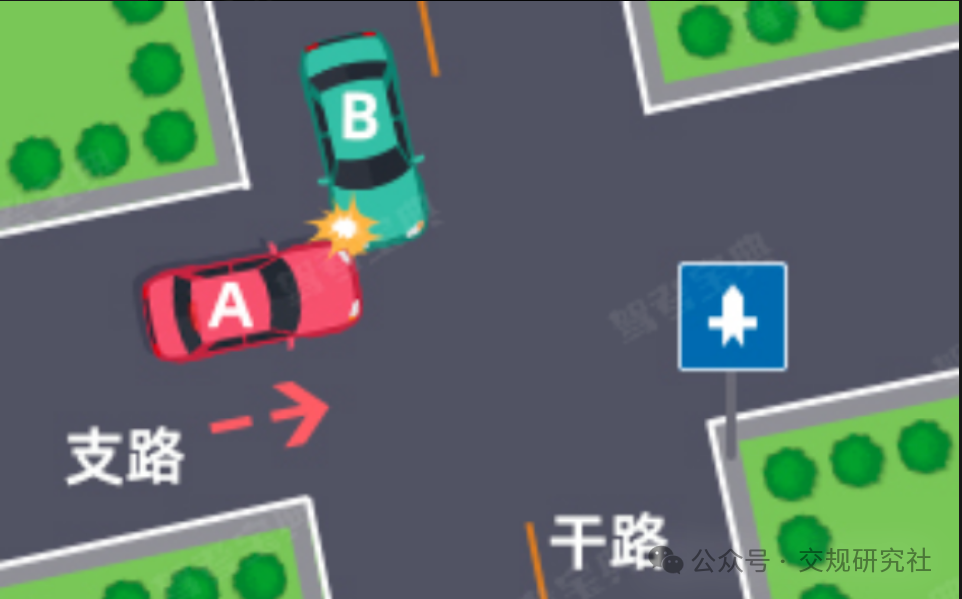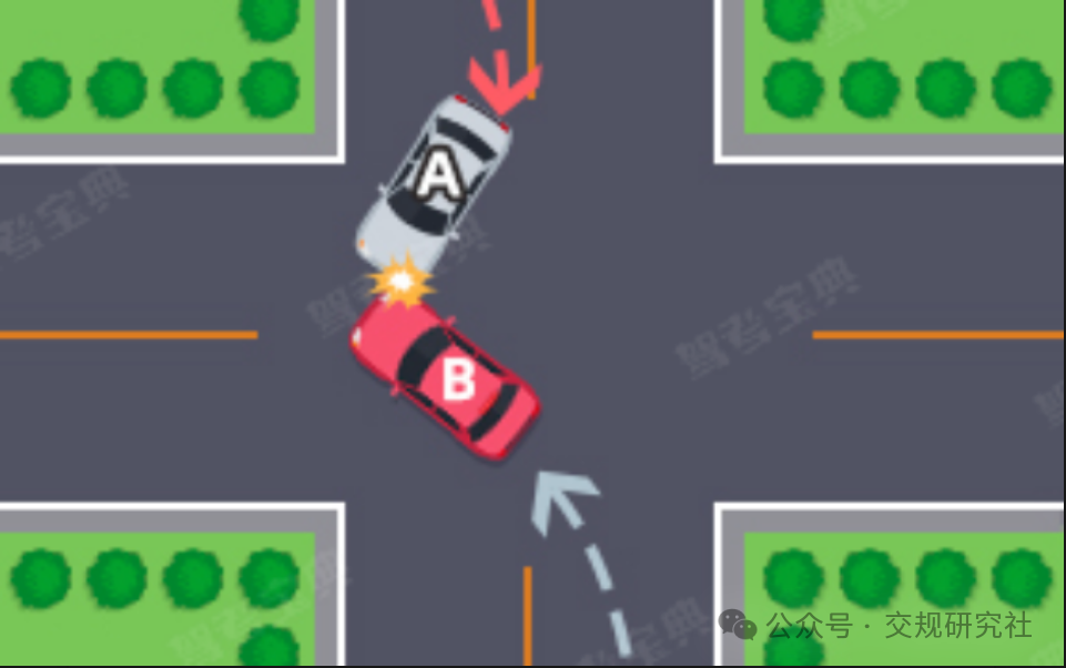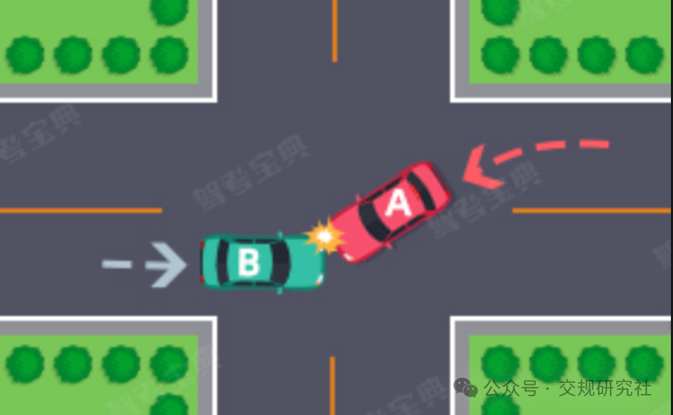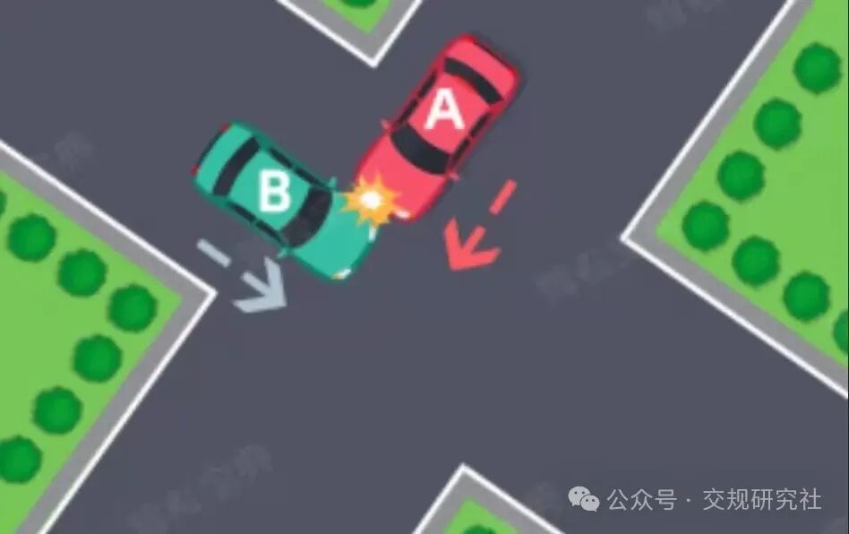 (五)通过没有交通信号灯控制或者交通警察指挥的交叉路口时,遇相对方向来车、左转弯车未让直行车先行的,图中所示为A车负全责。