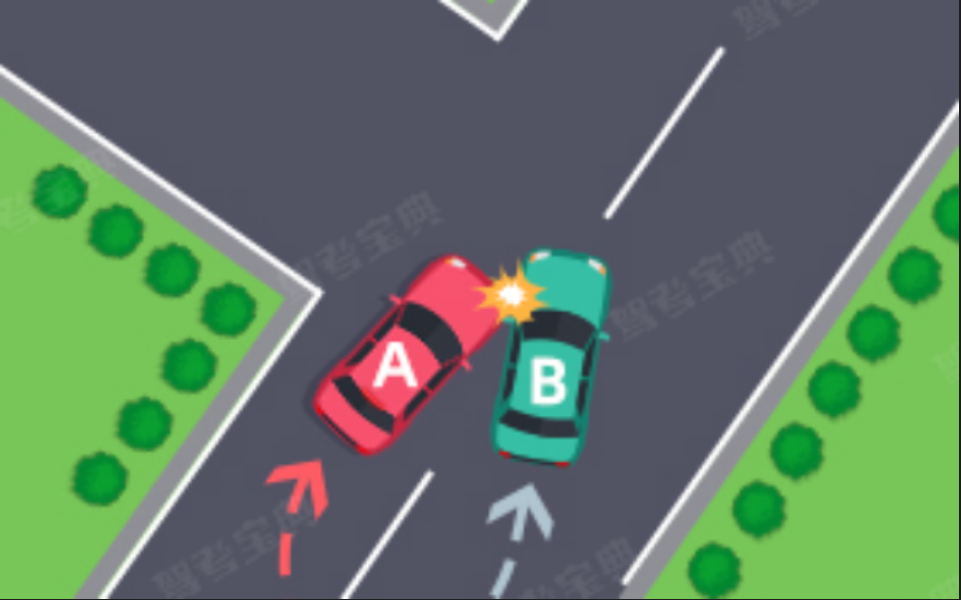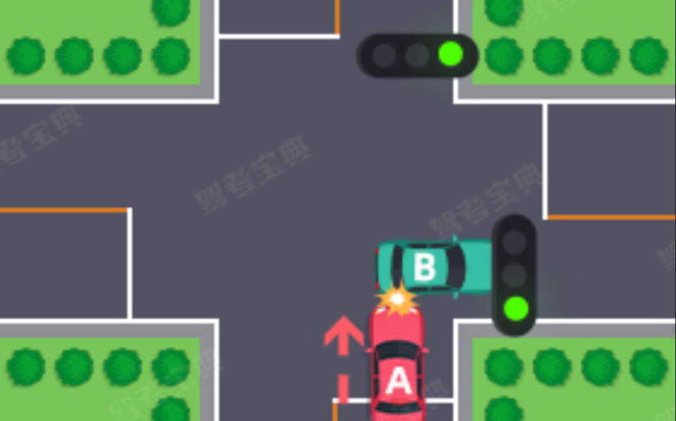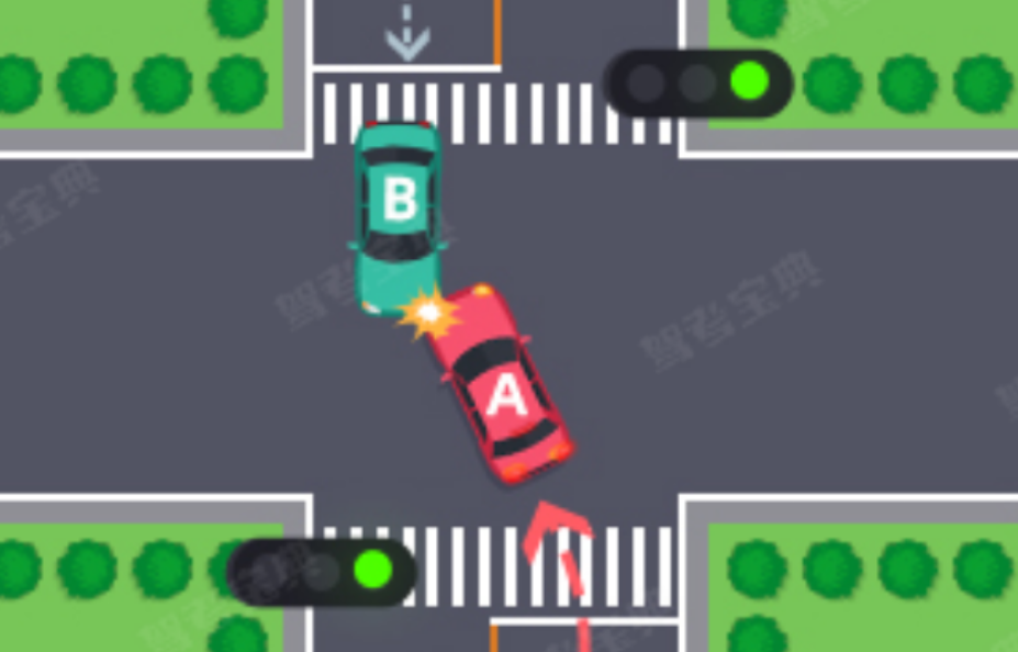 (七)绿灯亮时,转弯车未让被放行的直行车先行的,图中所示为A车负全责。