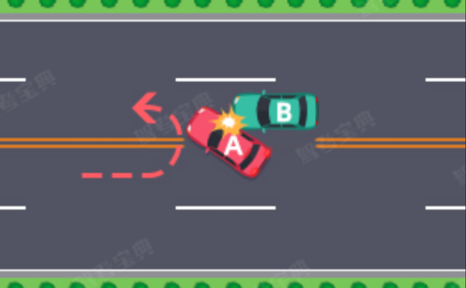 (二十)在没有禁止掉头标志、标线的地方掉头时,未让正常行驶车先行的,图中所示为A车负全责。